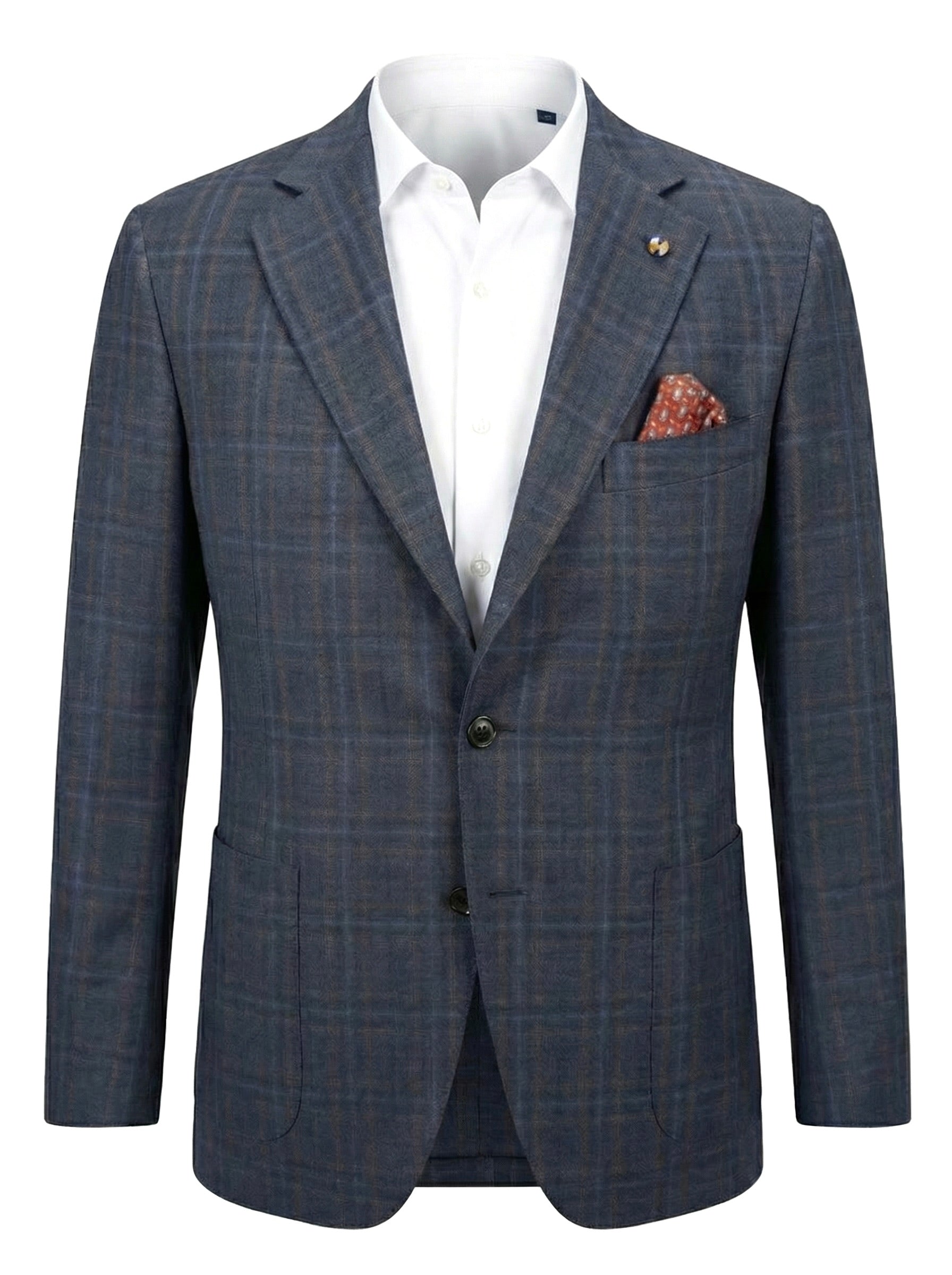 The subtle blue base with a soft orange windowpane pattern adds depth and character while remaining versatile enough for both business and casual styling. Finished with a classic two-button closure, notch lapel, and patch pockets, it delivers a relaxed yet polished silhouette.