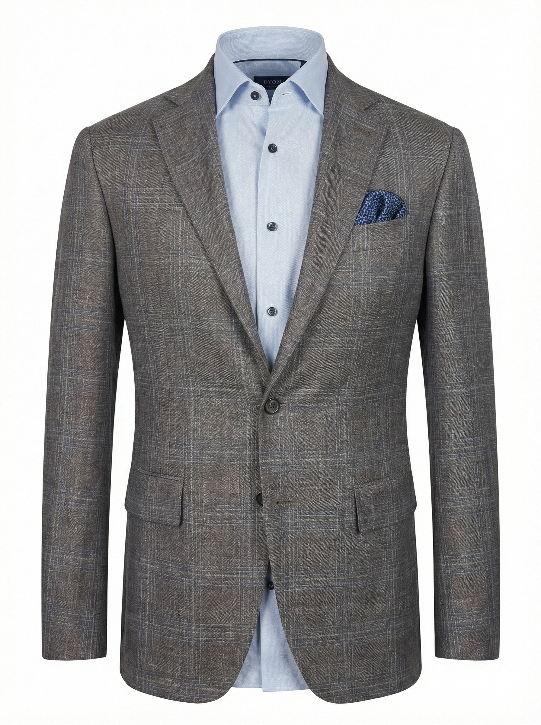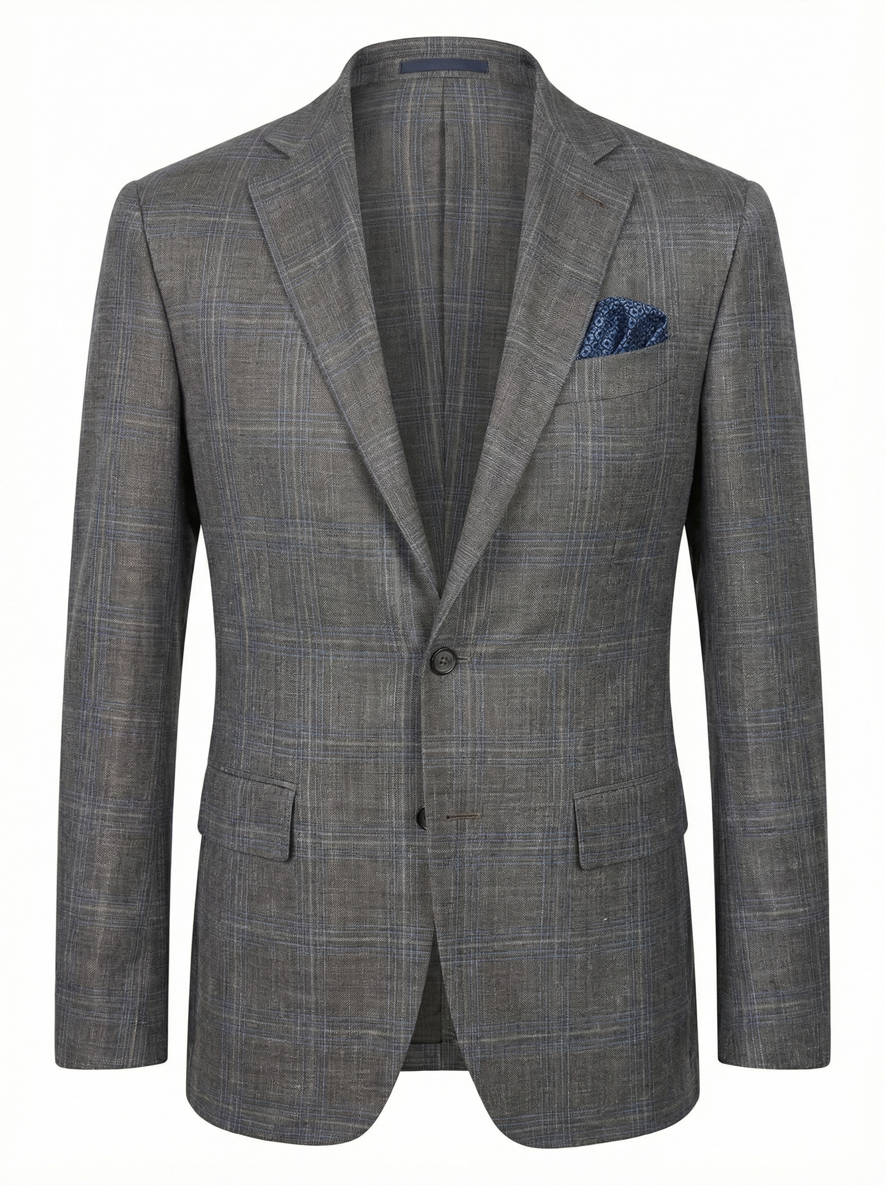 Canali Kei Model Wool, Silk & Linen Sport Coat in Mushroom Charcoal with Subtle Blue Windowpane offers refined Italian tailoring with lightweight comfort. Crafted from a luxurious wool, silk, and linen blend in a textured weave with a subtle windowpane pattern, this jacket delivers versatility for elevated casual and business-casual wear.