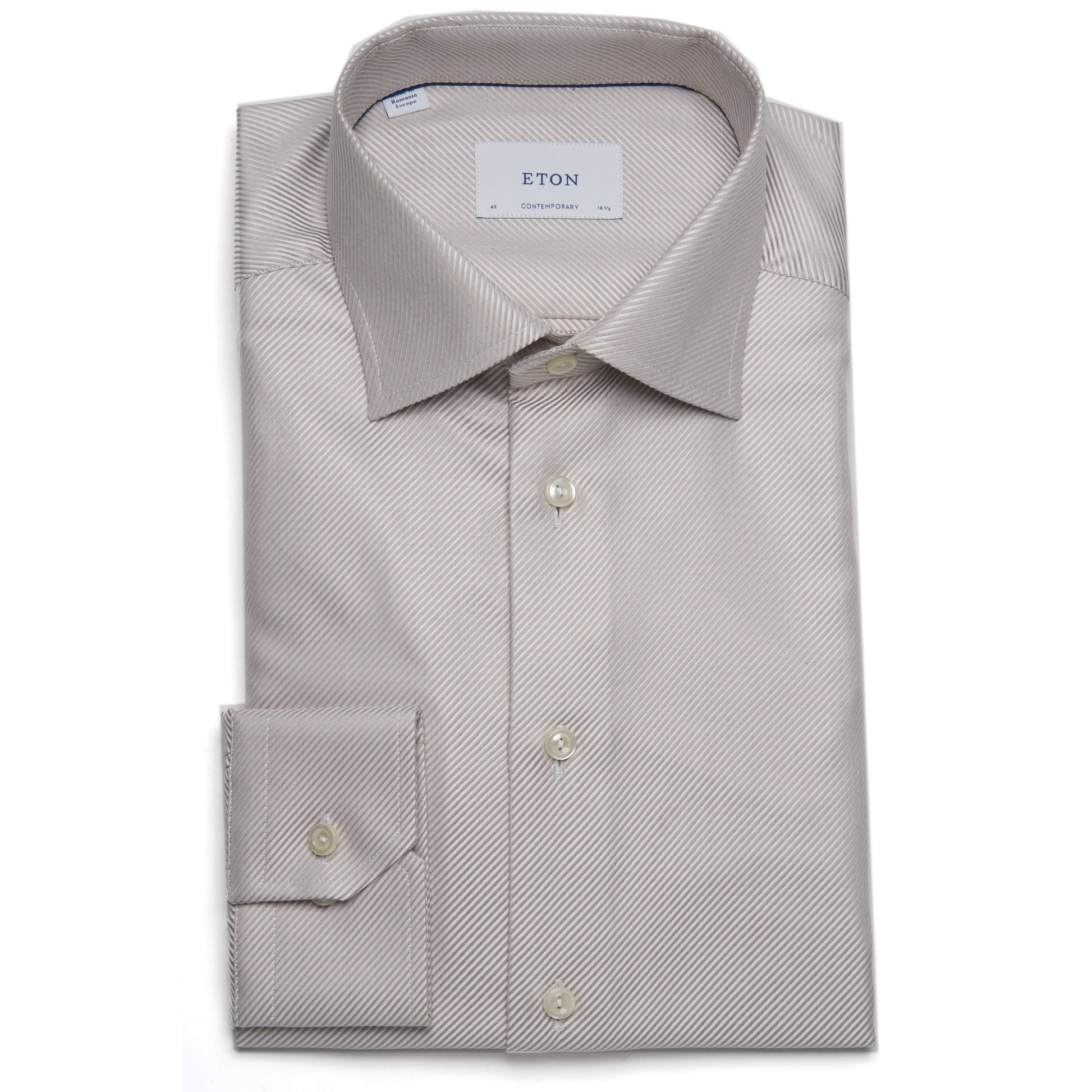 A dress shirt crafted from a wrinkle-resistant 100% organic cotton King Twill, with a solid design and distinct heavier-weight weave. It has a crisp, structured feel and is finished with white standard buttons for a sharp, refined look.