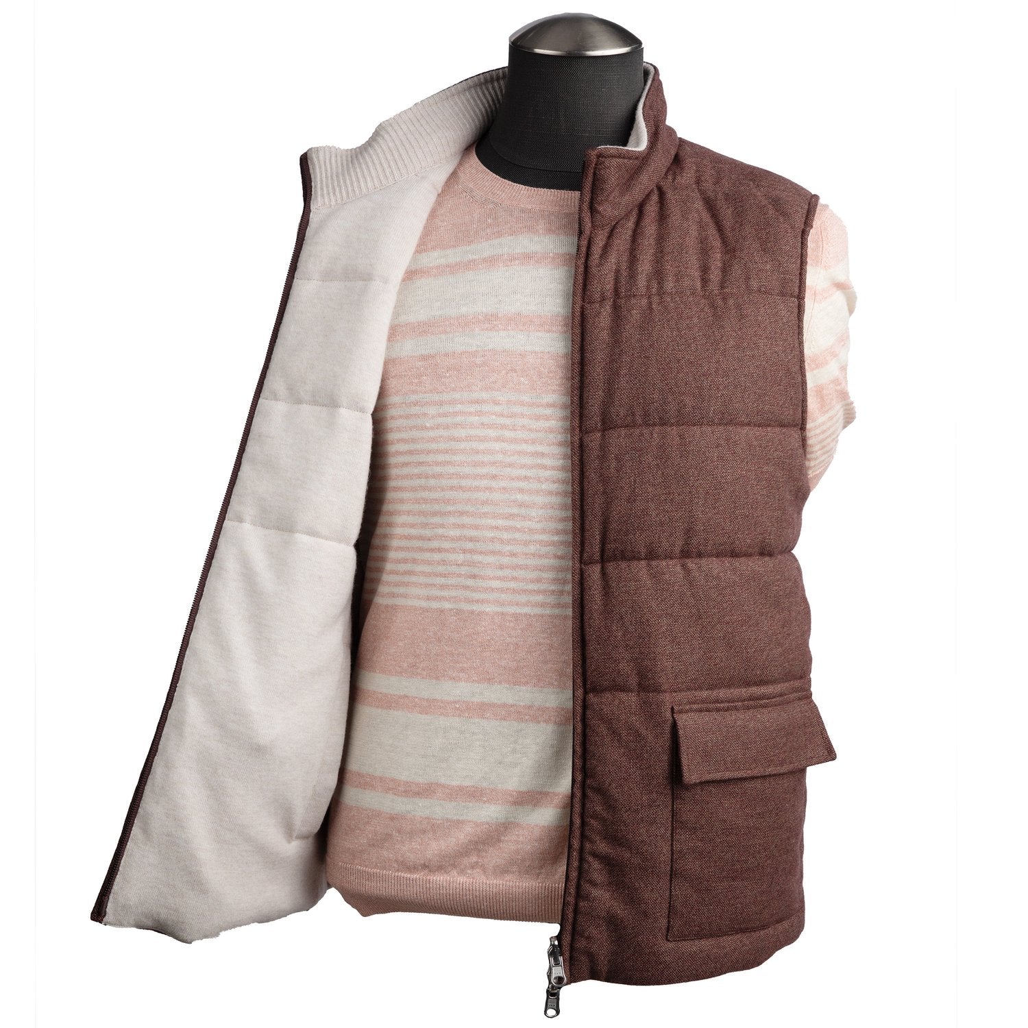 - Reversible Design: The vest features two wearable sides—mocha on one side and tan on the other, providing styling options to suit various outfits.