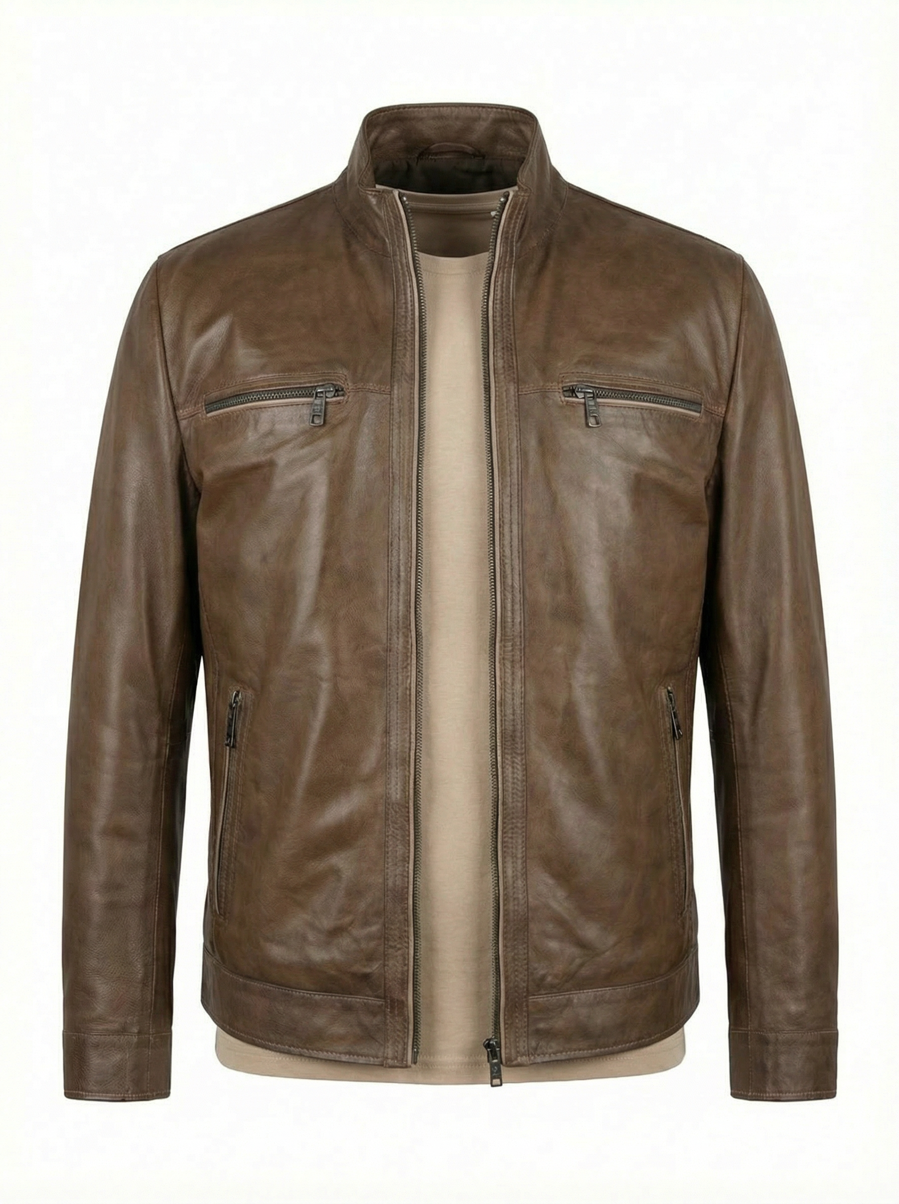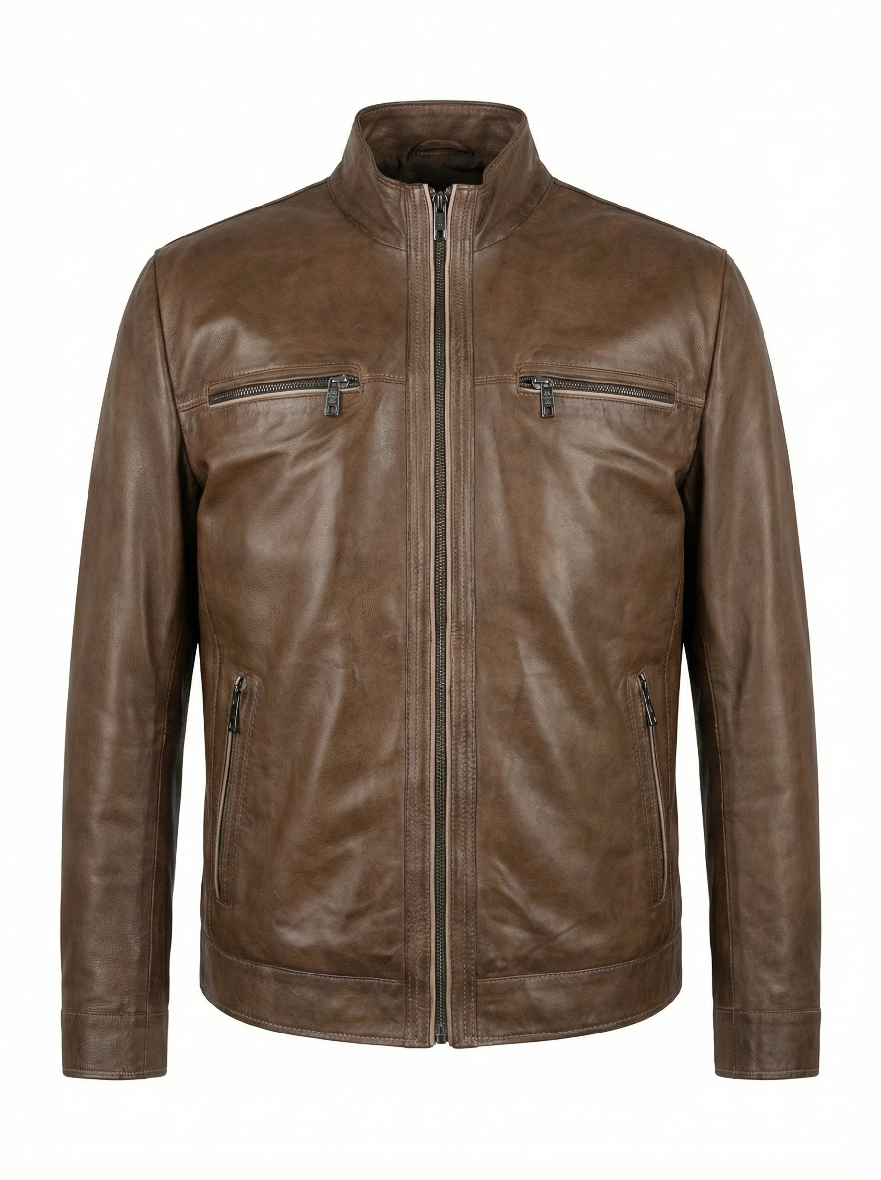 Handcrafted from supple lambskin nappa leather, this lightweight jacket offers exceptional softness and natural flexibility. The rich brown tone with subtle tonal variation enhances its refined yet slightly lived-in character.