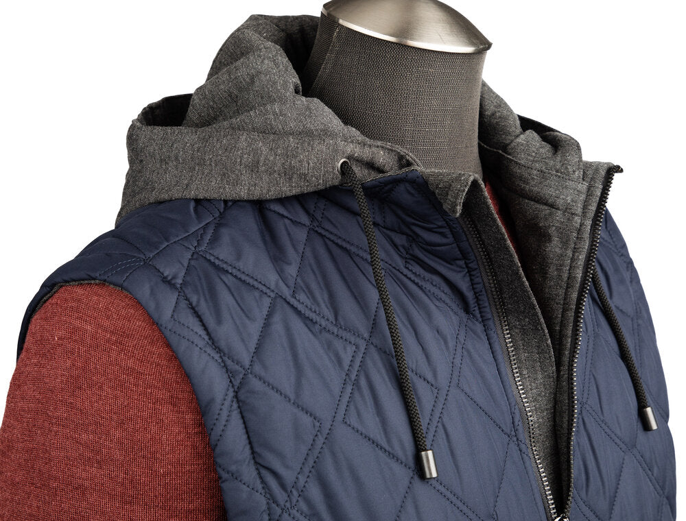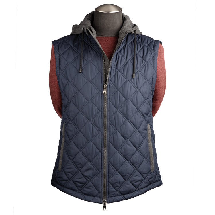 The Waterville Water Repellent Quilted Nylon Vest with Detachable Hoodie in Navy combines functional design with stylish versatility, perfect for outdoor adventures or casual urban wear. Crafted in Italy from high-tech, durable materials, this vest offers both warmth and breathability, making it ideal for transitional weather in fall or spring.