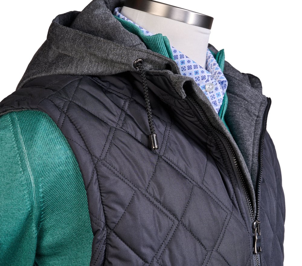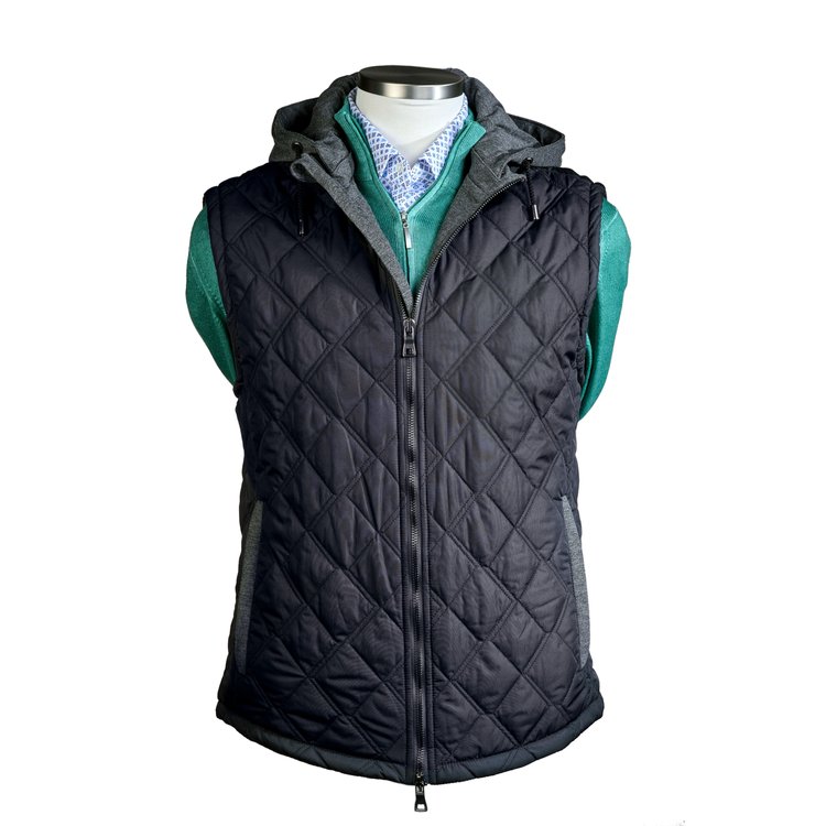 The Waterville Water Repellent Quilted Nylon Vest with Detachable Hoodie in Black combines functional design with stylish versatility, perfect for outdoor adventures or casual urban wear. Crafted in Italy from high-tech, durable materials, this vest offers both warmth and breathability, making it ideal for transitional weather in fall or spring.