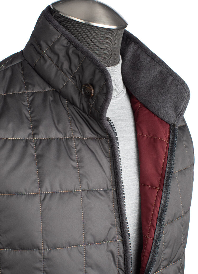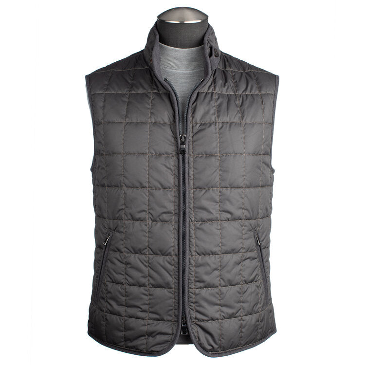 The Waterville Water Repellent Quilted Nylon Vest in Carbon is a versatile and stylish outerwear piece that blends comfort with functionality. Crafted in Italy, this vest is ideal for layering during fall or spring and offers a sleek, modern design.